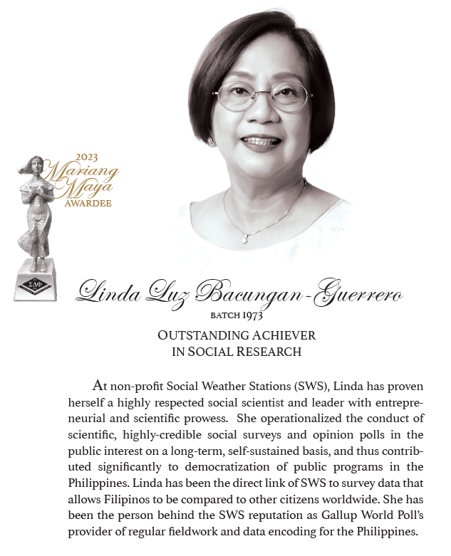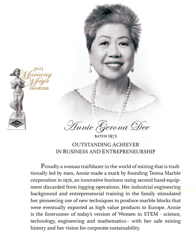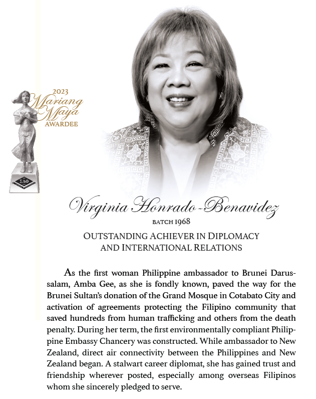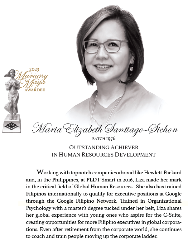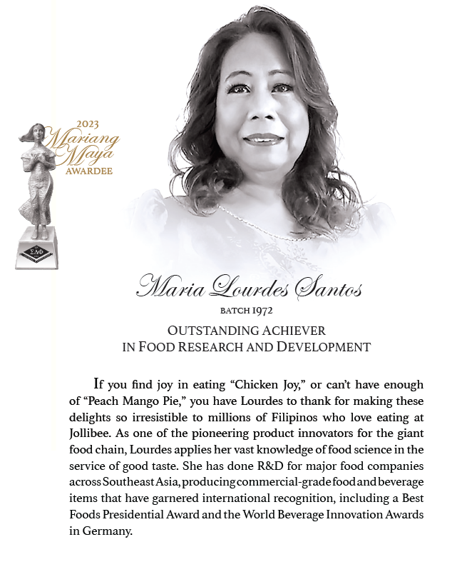 SINCE Sigma Delta Phi Sorority (ΣΔΦ) turned 50 years old in 1983, the Mariang Maya Award has been a way to celebrate and honor outstanding members. Editha “Nenet” Lazo-Arambulo Batch ’53 and Betty Go Belmonte ’52 were president and vice president respectively of the grand event, made possible by the work of many dedicated sisters. Every five years since then, sisters have been nominating sisters as a mark of peer recognition. The Award was conceived to inspire integrity, credibility, and holistic personal development.